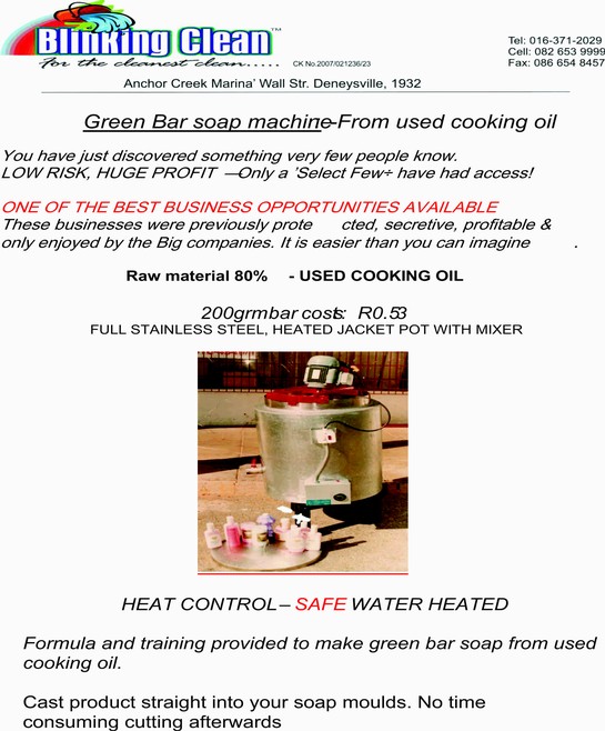 The Raw material is "USED COOKING OIL" collected at a very low price from restuarants, hotels, take aways and road houses ! Machine can make batches of up to 150 kg.